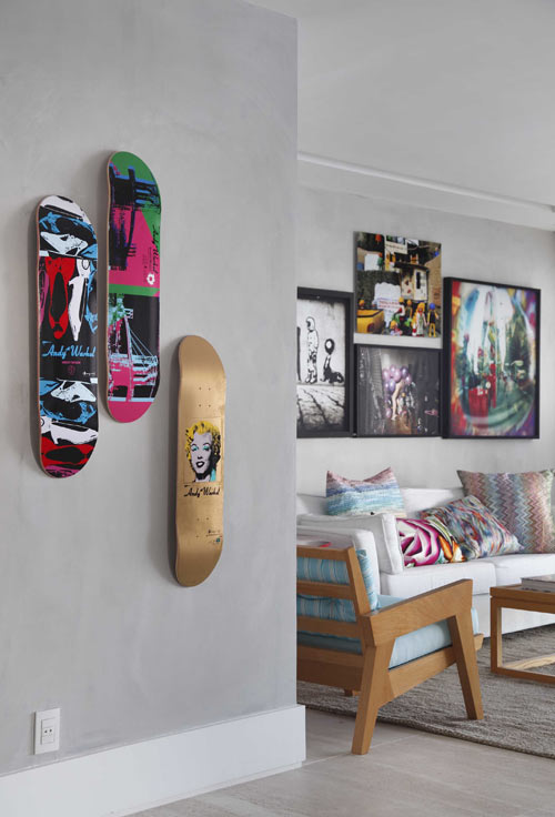 Veja que belo projeto assinado por Gisele Taranto Arquitetura localizado em São Conrado - Rio de Janeiro. As paredes da sala são feitas de cimento cinza para criar uma base neutra para as peças de arte colorida. O piso também é um sutil, mármore travertino, mas elegante. Realmente adoro a forma como o projeto do apartamento foi feito para ser um pano de fundo para os acessórios vibrante e emocionante, mobiliário e uma colecção única de arte.